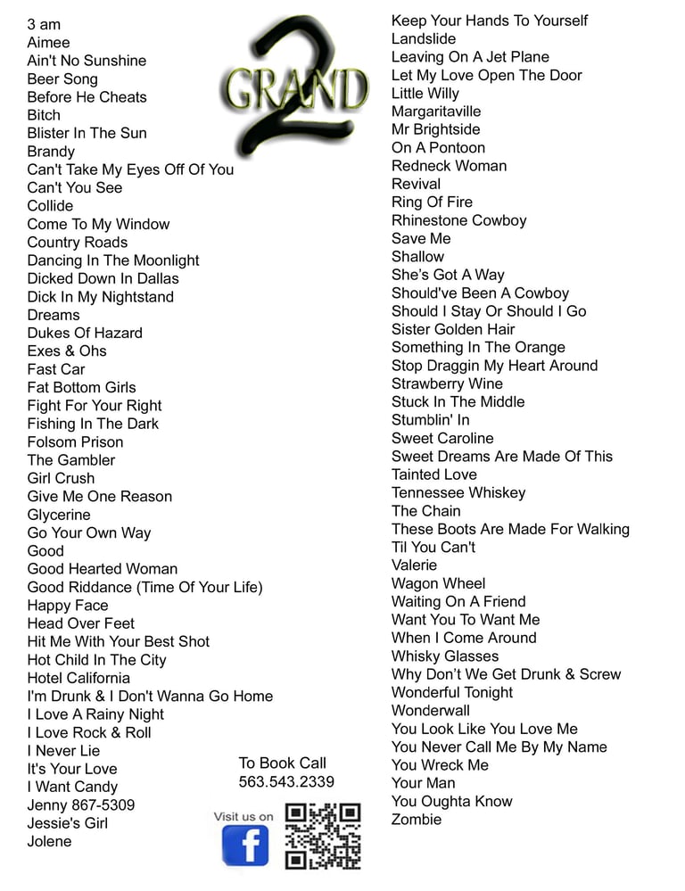 "Discover the infectious energy of 2 Grand Duo, a captivating two-piece band! I highly recommend them! They do some great remakes!! They always take requests too! Get out there and see 2 grand duo!"